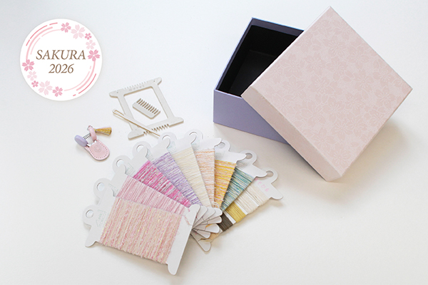8種の春色糸とポケおりを、さくら色の和紙の小箱に収めました 。織り上がったモチーフは、贈りものや小物づくりにも活躍します。