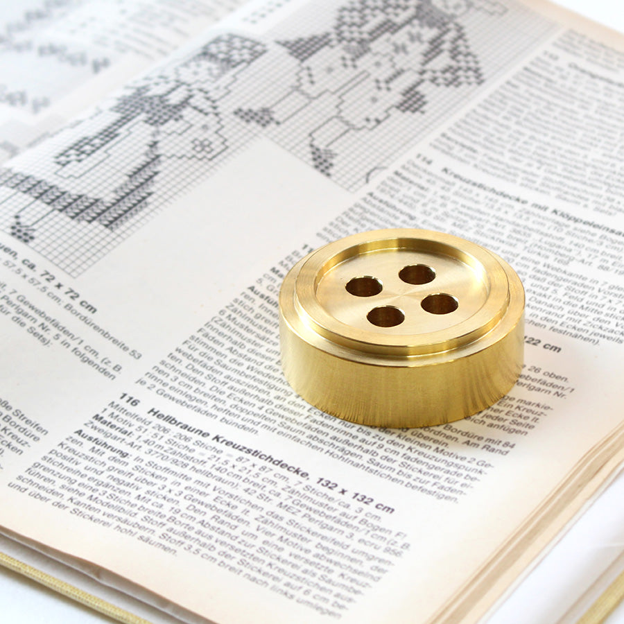 ボタンをモチーフにした文ちんは洋裁用としてだけでなく、ブックストッパー、ペーパーウェイトとしても使用できます。ボタン穴はペン立てとしても活躍します。