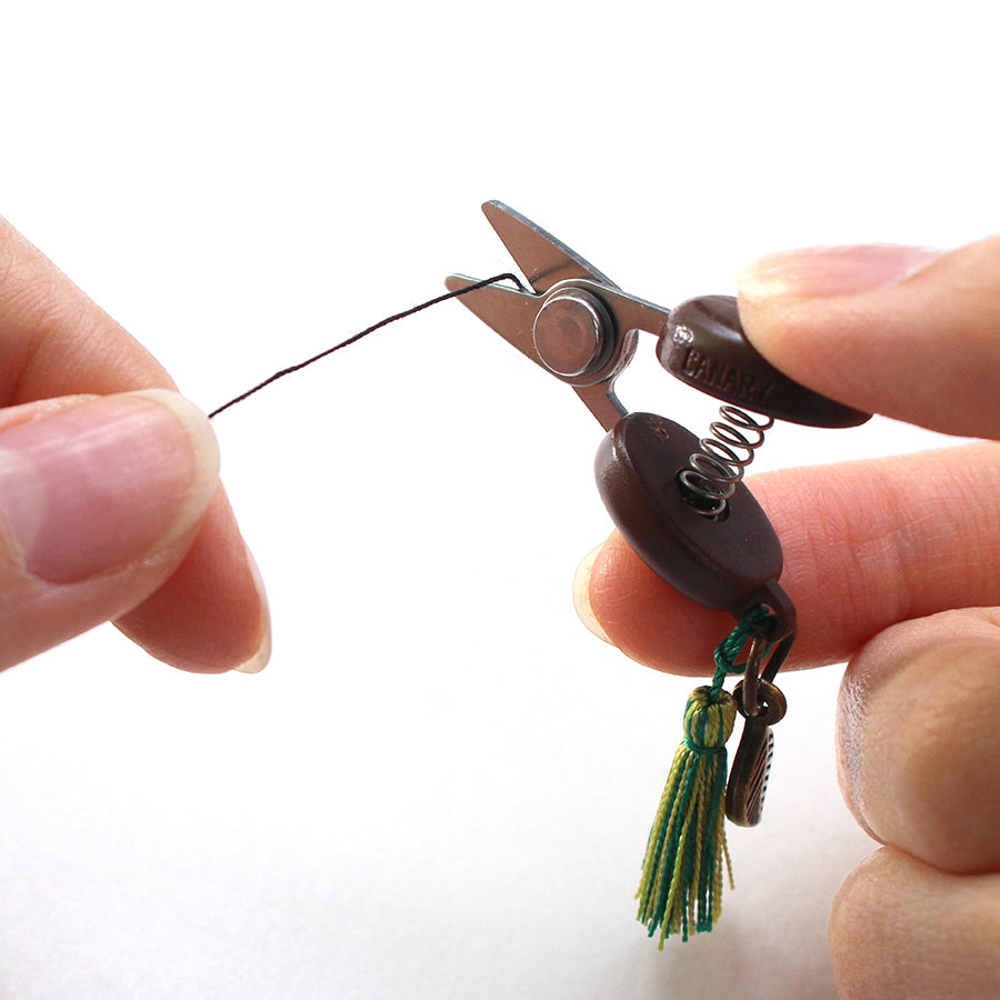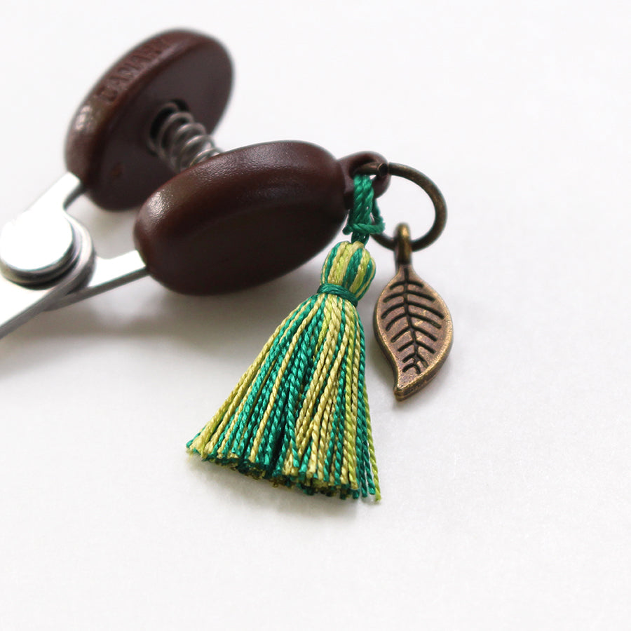 関の豆ばさみには、グリーンミックスのタッセルと、葉っぱのチャームをつけました。赤い革ケースは、りんごの実をイメージした赤色です。指でつまむように持つだけで糸が切れるので、頻繁に糸を切るような作業中も、ストレスなく使うことができます。