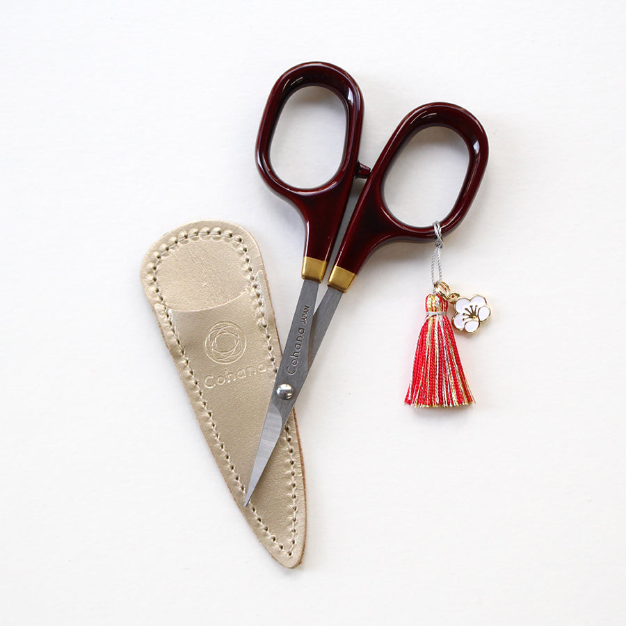 定番の溜塗りの小ばさみに、限定のゴールドの革ケースとタッセルを添えました。小さな梅のチャームが付いています。