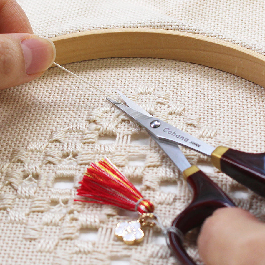 白梅のチャームが付いた、深みのある艶をたたえた漆と金蒔絵の小ばさみ〈溜塗り〉、梅柄の京ちりめんで揃えた小間物ポーチと豆箱に入った待針、梅結びの飯田水引の糸通しなど、縁起のいい梅の意匠をまとった道具を揃えました。針仕事の時間が、より豊かに華やぎます。